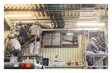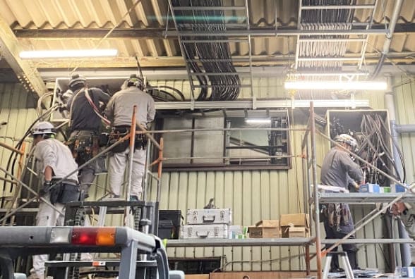 PASからキュービクルへ高圧の電気を引き込むケーブルも更新します。 工場内の高所部分に足場を組み、安全第一で確実な敷設作業を行いました。