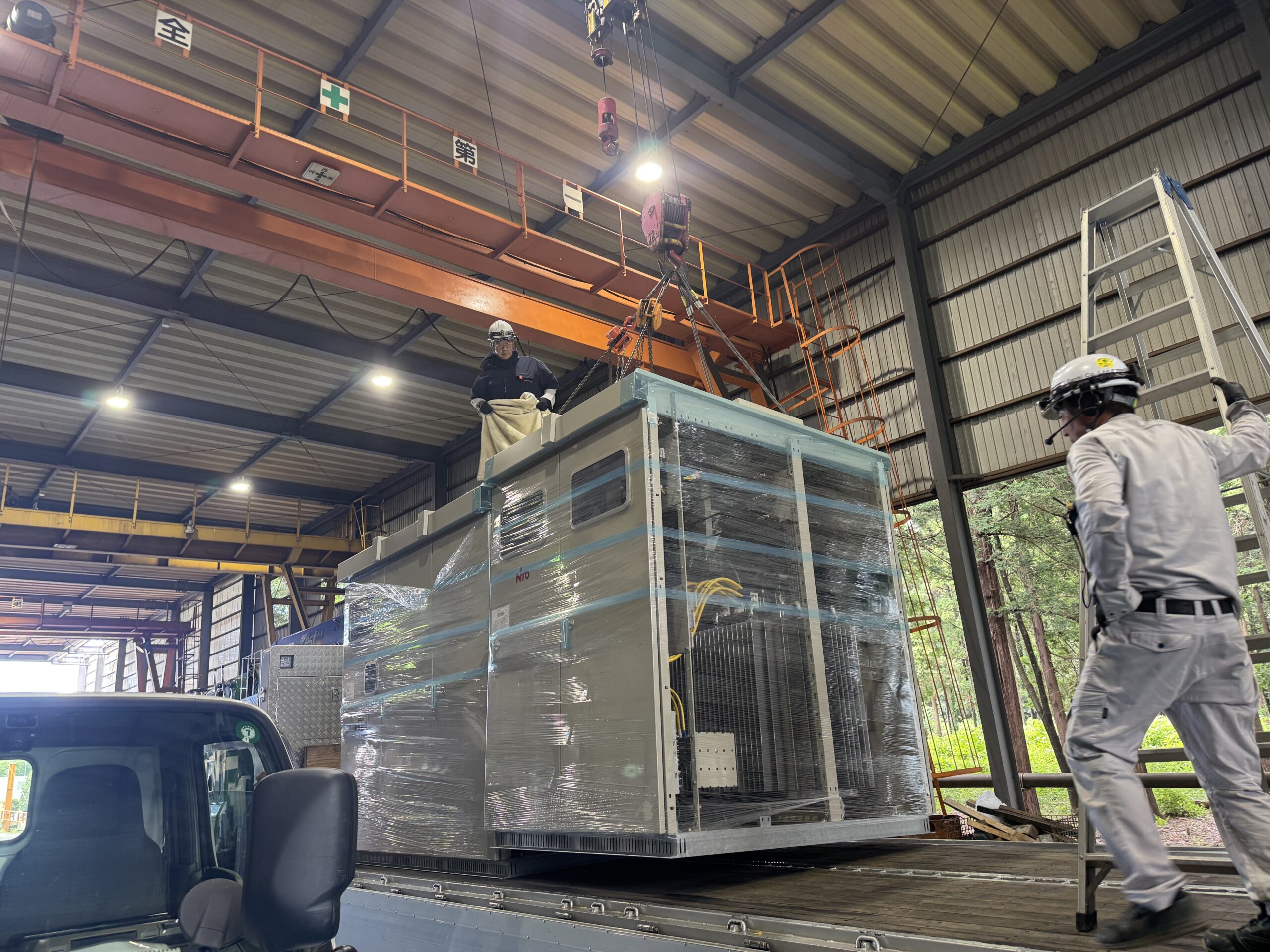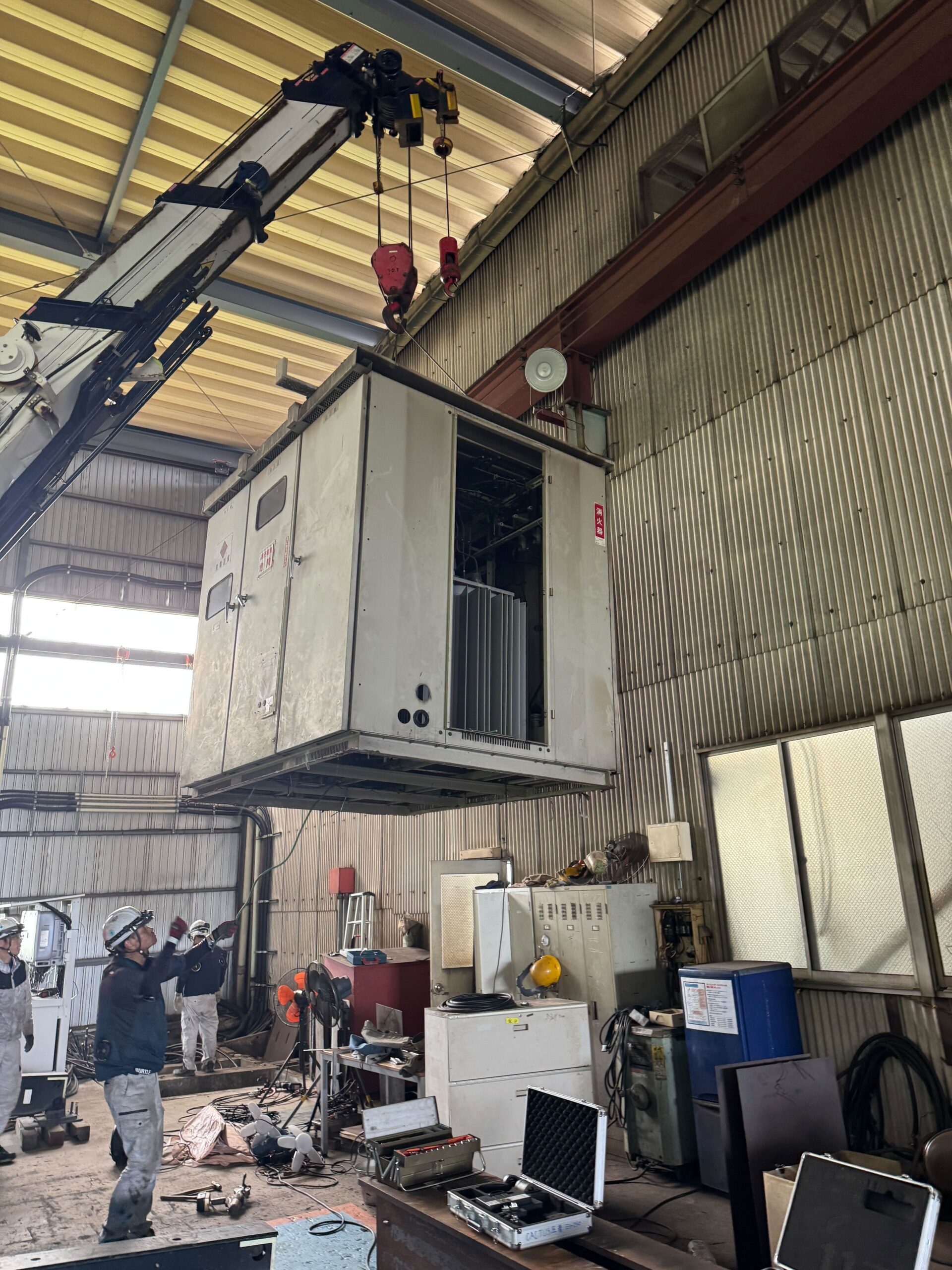 役割を終えた古いキュービクルを撤去します。 配線の切り離しを行い、安全を確保した上で、こちらもクレーンを使って搬出します。長年の稼働、お疲れ様でした。