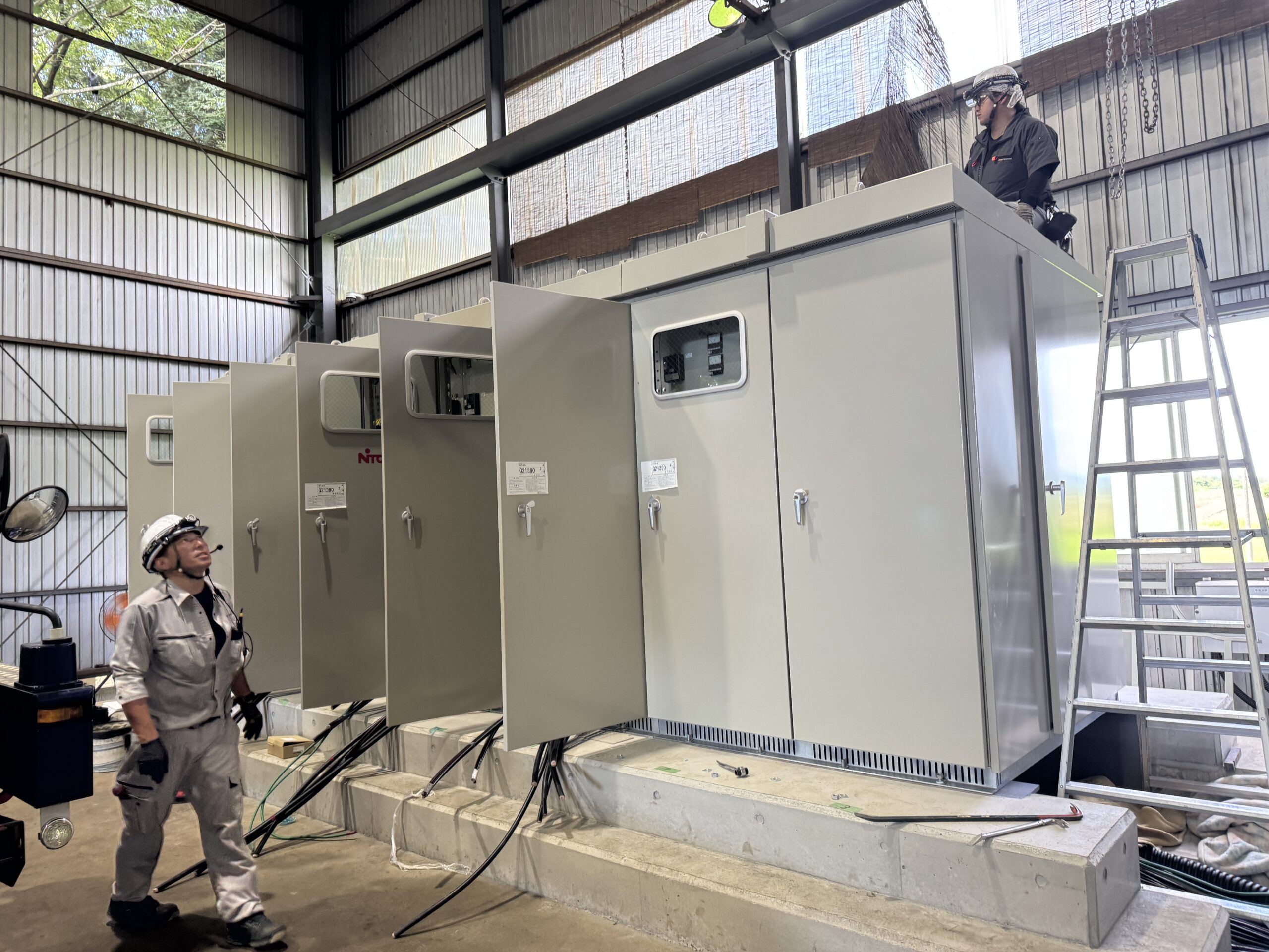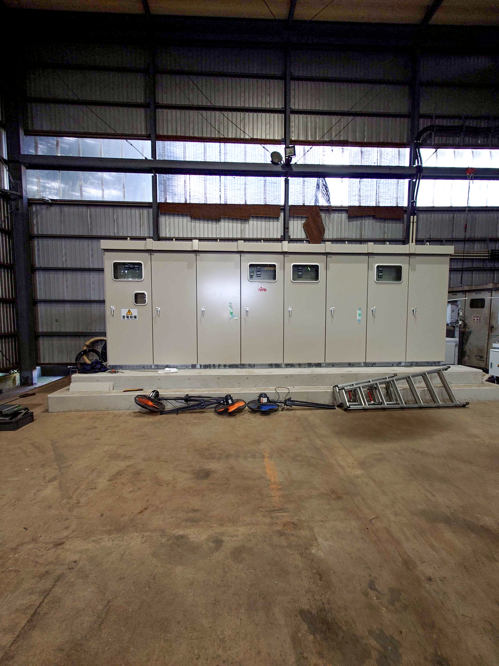 無事に新しいキュービクルが所定の位置に収まりました。 白く清潔感のある筐体で、工場の雰囲気も明るくなります。しかし、工事はここで終わりではありません。