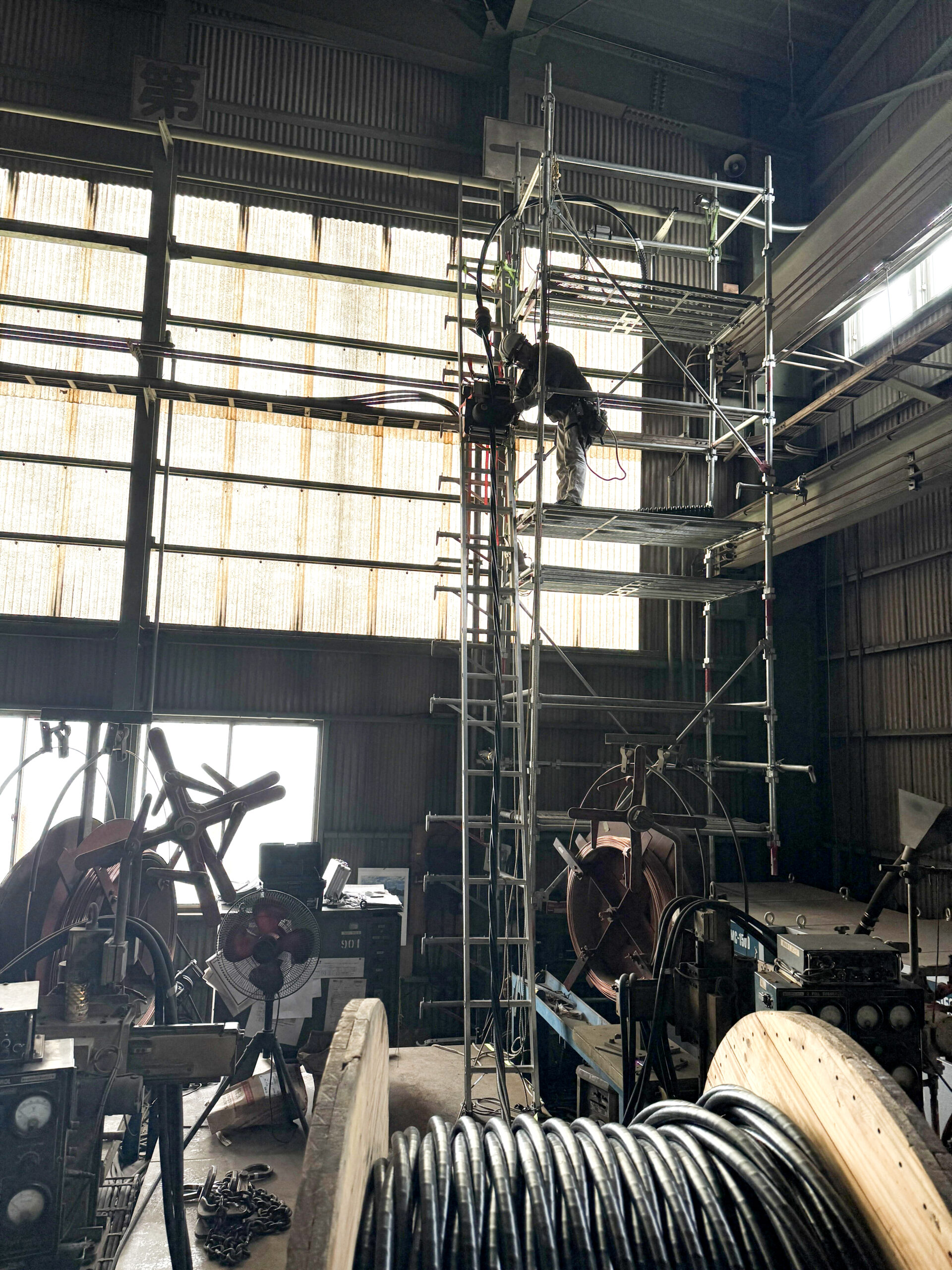 PASからキュービクルへ高圧の電気を引き込むケーブルも更新します。 工場内の高所部分に足場を組み、安全第一で確実な敷設作業を行いました。