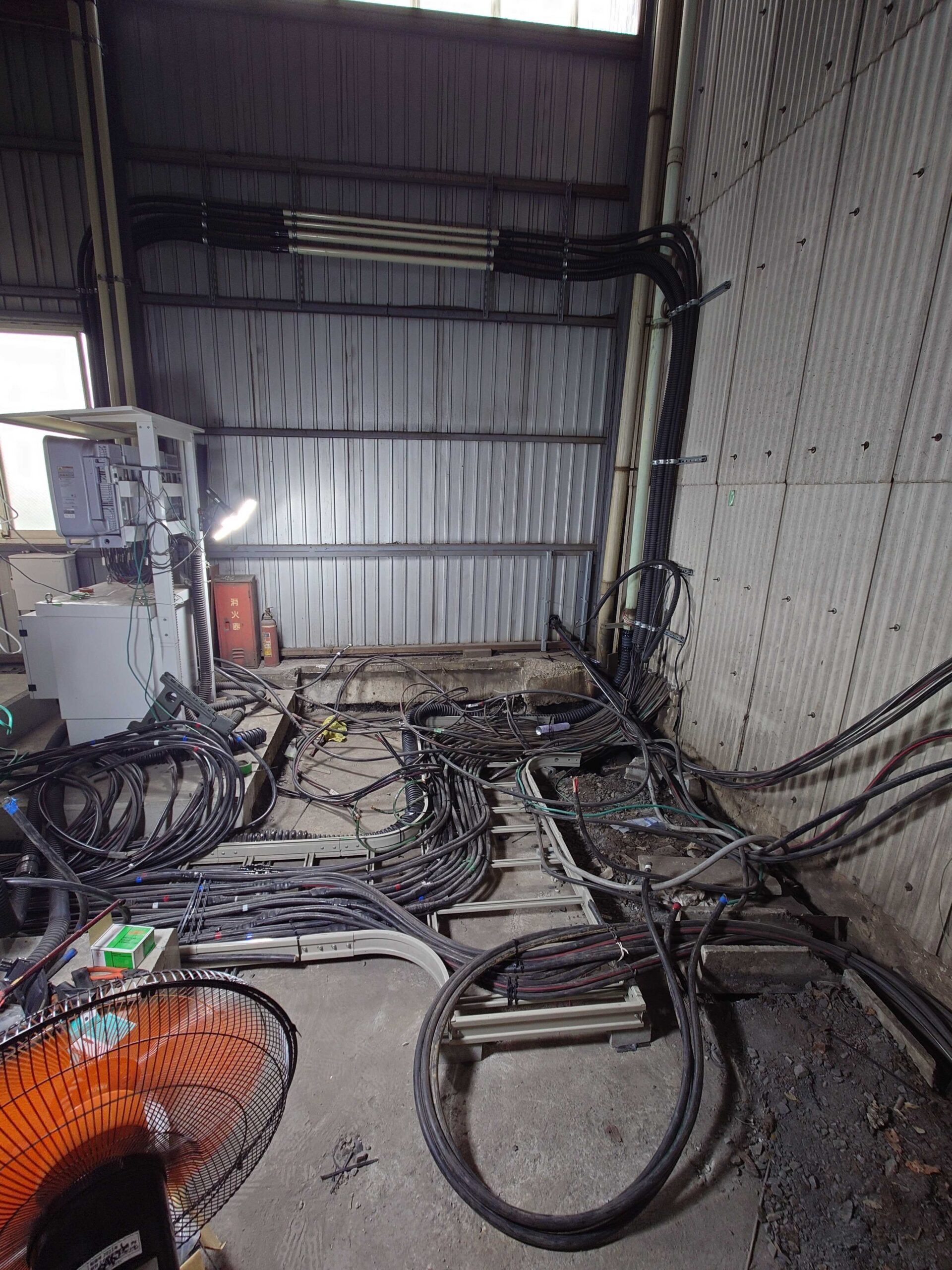設置場所が変わったため、工場内へ電気を送るケーブル(低圧幹線)を新しい場所まで届くように延長する必要があります。 既設のピット(配線溝)を活用しながら、太いケーブルを整然と延長・接続し、美しく配線処理を行いました。