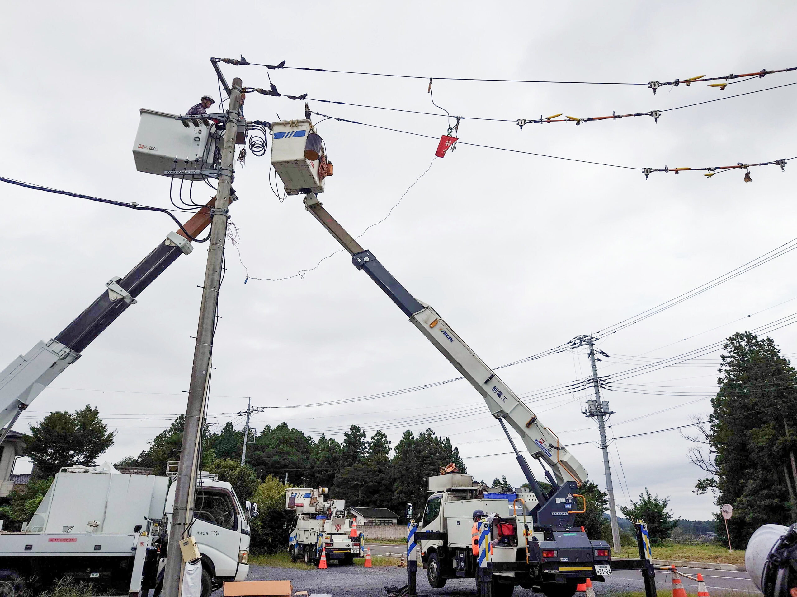 工場外周りの設備も同時にリフレッシュします。 電柱の上にある「高圧気中開閉器(PAS)」を高所作業車を使って交換。ここを新品にすることで、波及事故(近隣への停電被害)を防ぐことができます。