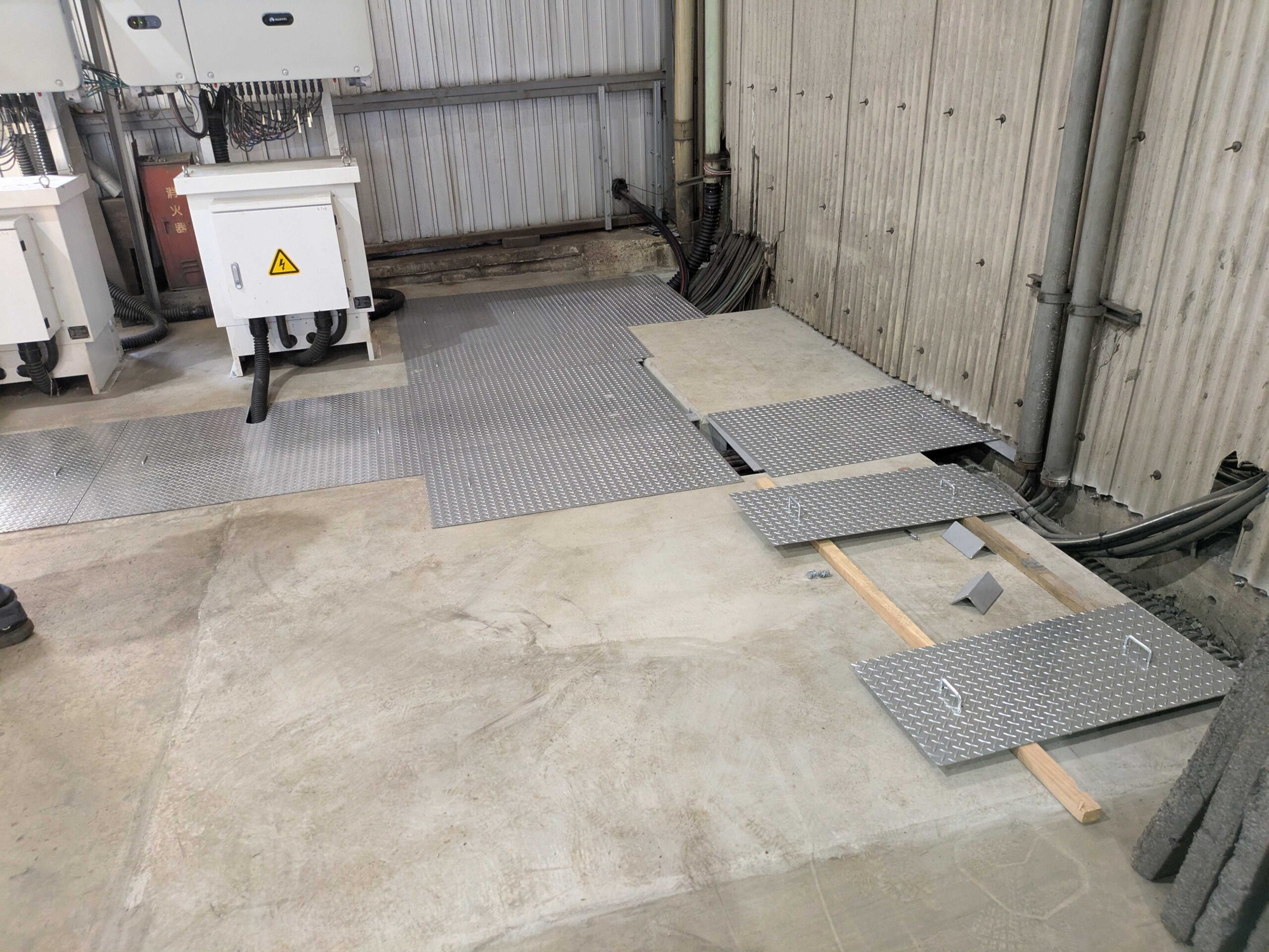 最後に、古いキュービクルがあった場所の処理です。 撤去によって露出した床下の配線溝(ピット)に、歩行しても安全なよう縞鋼板(しまこうはん)で蓋を製作・設置しました。 つまずき防止の段差処理も行い、工場の有効スペースとして活用できるよう綺麗に仕上げて完工です。